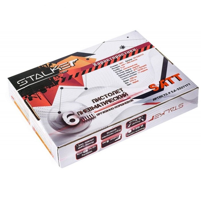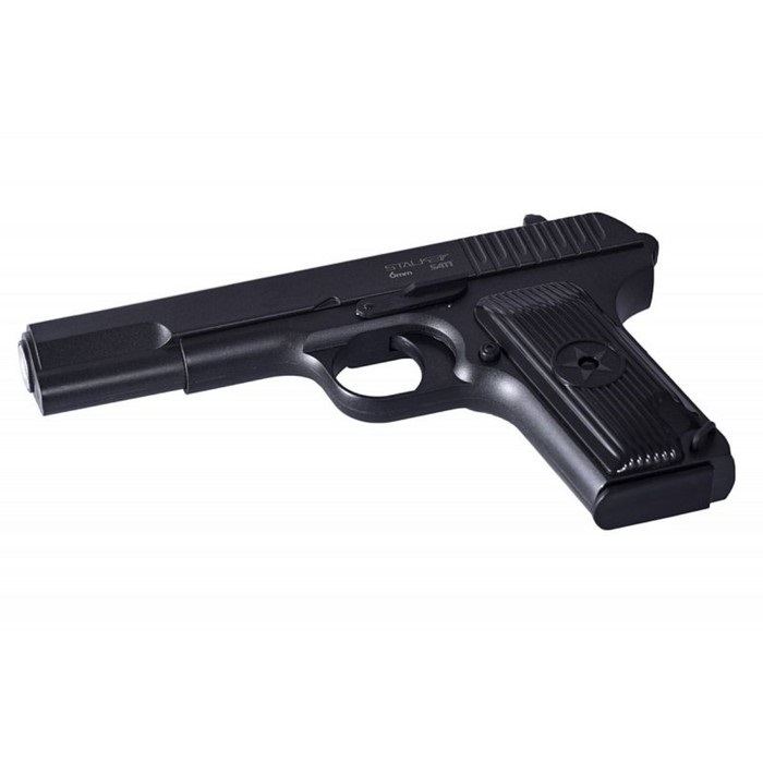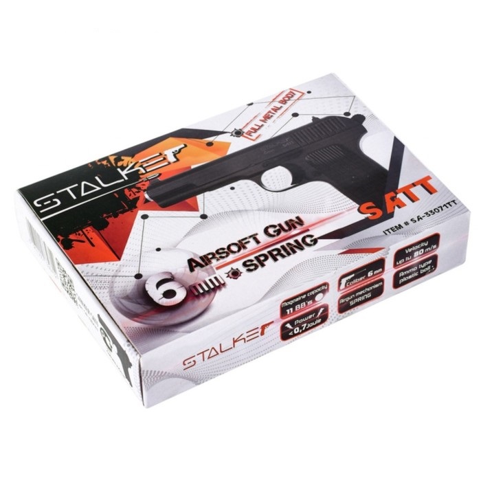 Не является оружием - конструктивно сходное с оружием изделие.ВНИМАНИЕ!Открытое ношение и имитация применения конструктивно сходного с оружием изделия как боевого оружия может ввести в заблуждение работников правоохранительных органов или граждан и дать им основания для применения против Вас огнестрельного оружия или иных средств самозащиты. Пистолет пневматический Stalker SATT Spring, калибр 6 мм, корпус - металл, магазин 11 шариков, до 80 м/с. Для стрельбы не требуются баллоны с газом СО2. Метание осуществляется за счет энергии предварительно взведенной пружины. Использует для стрельбы пластиковые шарики диаметром 6 мм и весом от 0,12 г до 0,25 г. При этом они в состоянии обеспечить дульную скорость шарика в диапазоне от 50 м/с до 80 м/с. Идеально подойдет для безопасного обучения стрельбе. Технические характеристики позволяют с успехом использовать пистолет как для стрельбы по мишеням, так и для игры в страйкбол. Корпус изготовлен из сплавов на основе цинка, что обеспечивает высокую надежность и долговечность. Не является оружием/конструктивно сходное с оружием изделие.
