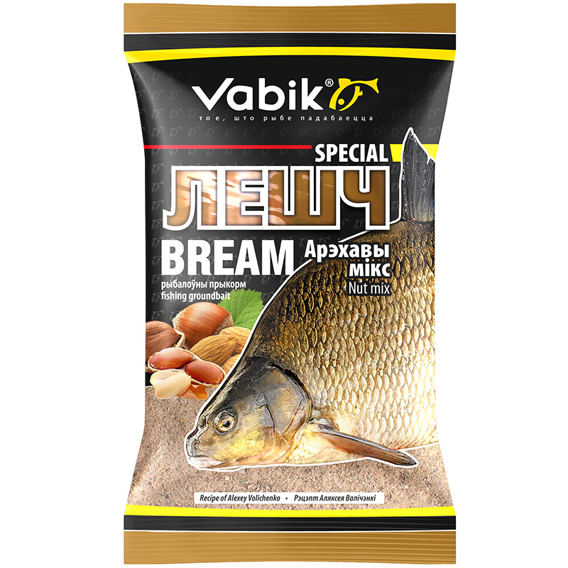 Одна из самых популярных прикормочных смесей для ловли леща. Содержит натуральные орехи, обладает соответствующим ароматом, средним помолом, с вкраплением крупных частиц в виде оранжевого и зелёного печива.